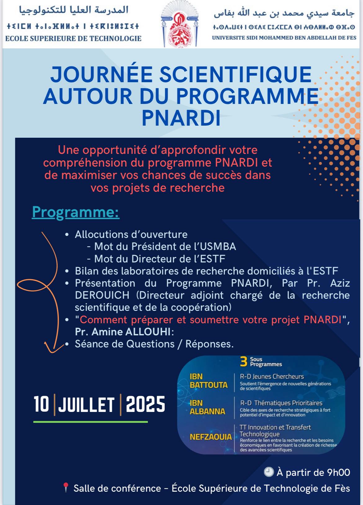 Ce 10 juillet 2025, l’École Supérieure de Technologie de Fès a organisé avec succès une journée scientifique dédiée au programme PNARDI (Programme National d’Appui à la Recherche et au Développement).