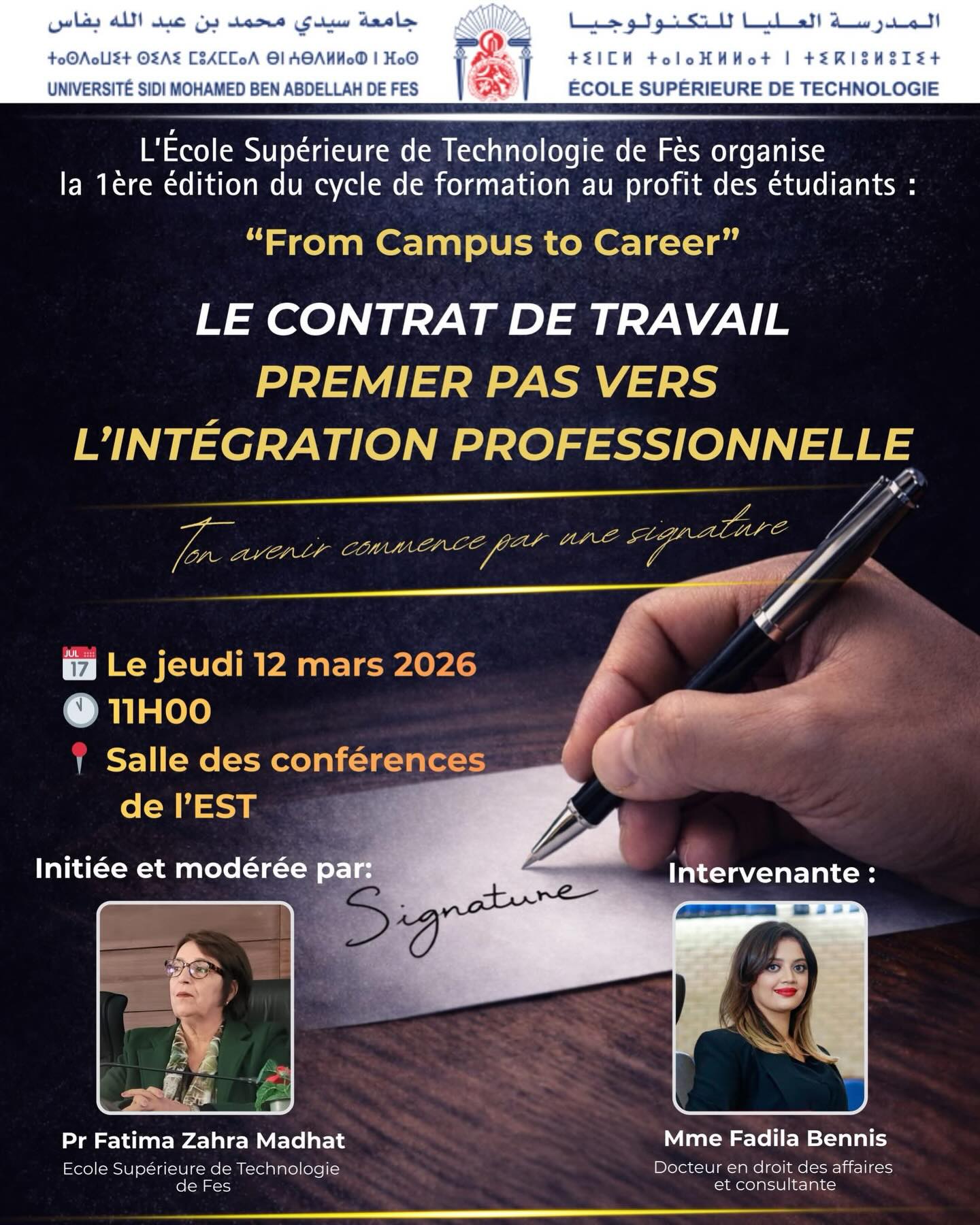 Jeudi 12 mars 2026, nous avons eu le plaisir d’accueillir Dr. Fadila Bennis, qui a animé une formation sur : « Le contrat de travail : premier pas vers l’intégration professionnelle ».
